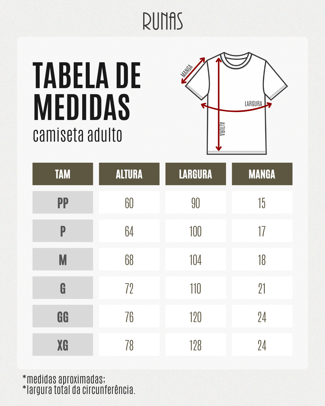 Camiseta basica com estampa em DTF frontal esquerda escrito Runas, feita em meia malha e com ribana na gola.